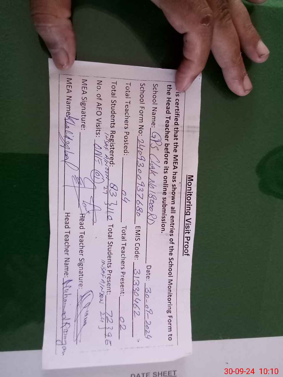 | EMIS Code: 31330462 | Name of School: GPS CHAK NO.18000/RD | |||