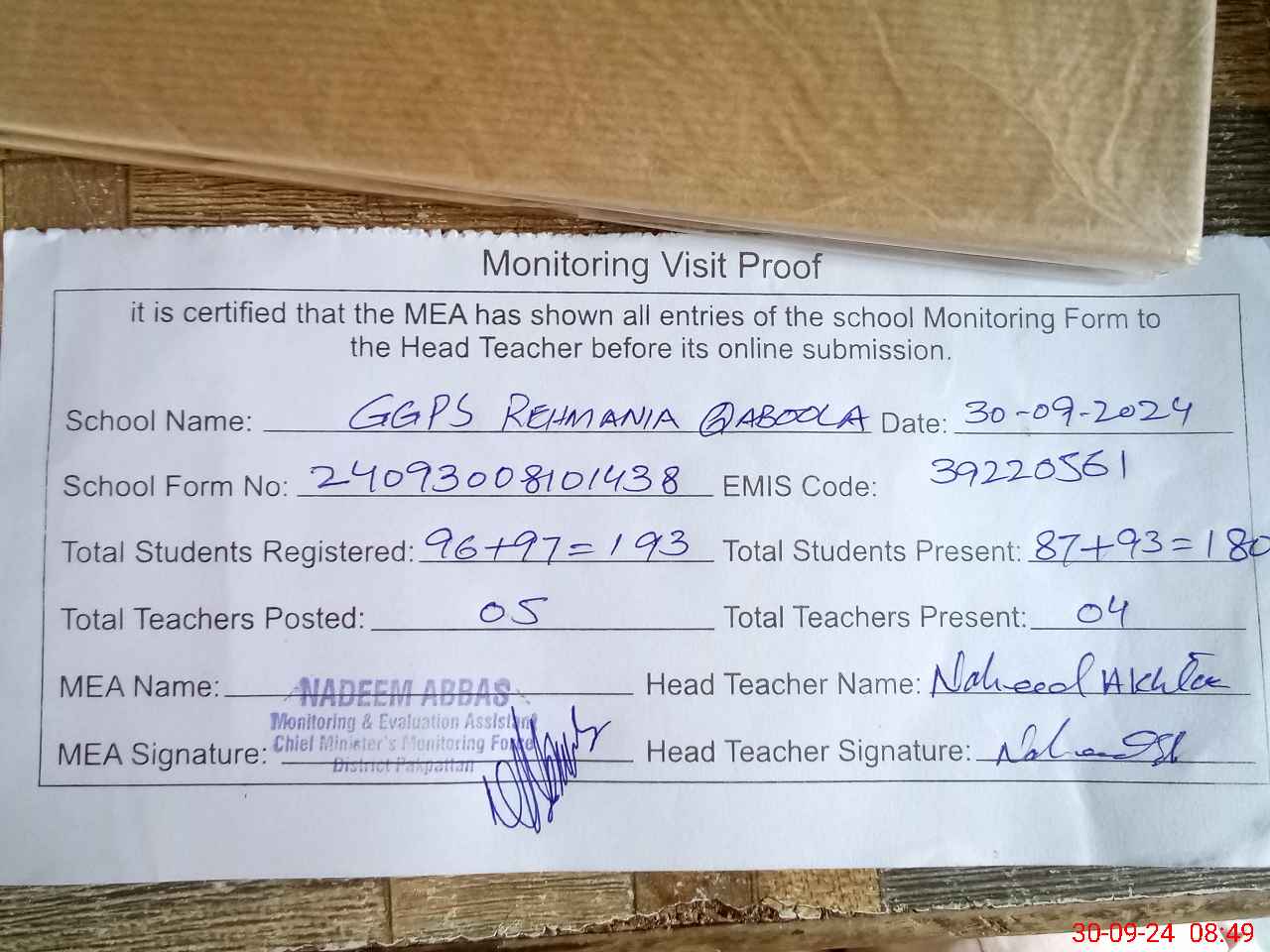 | EMIS Code: 39220561 | Name of School: GGPS REHMANIA QABOOLA | |||