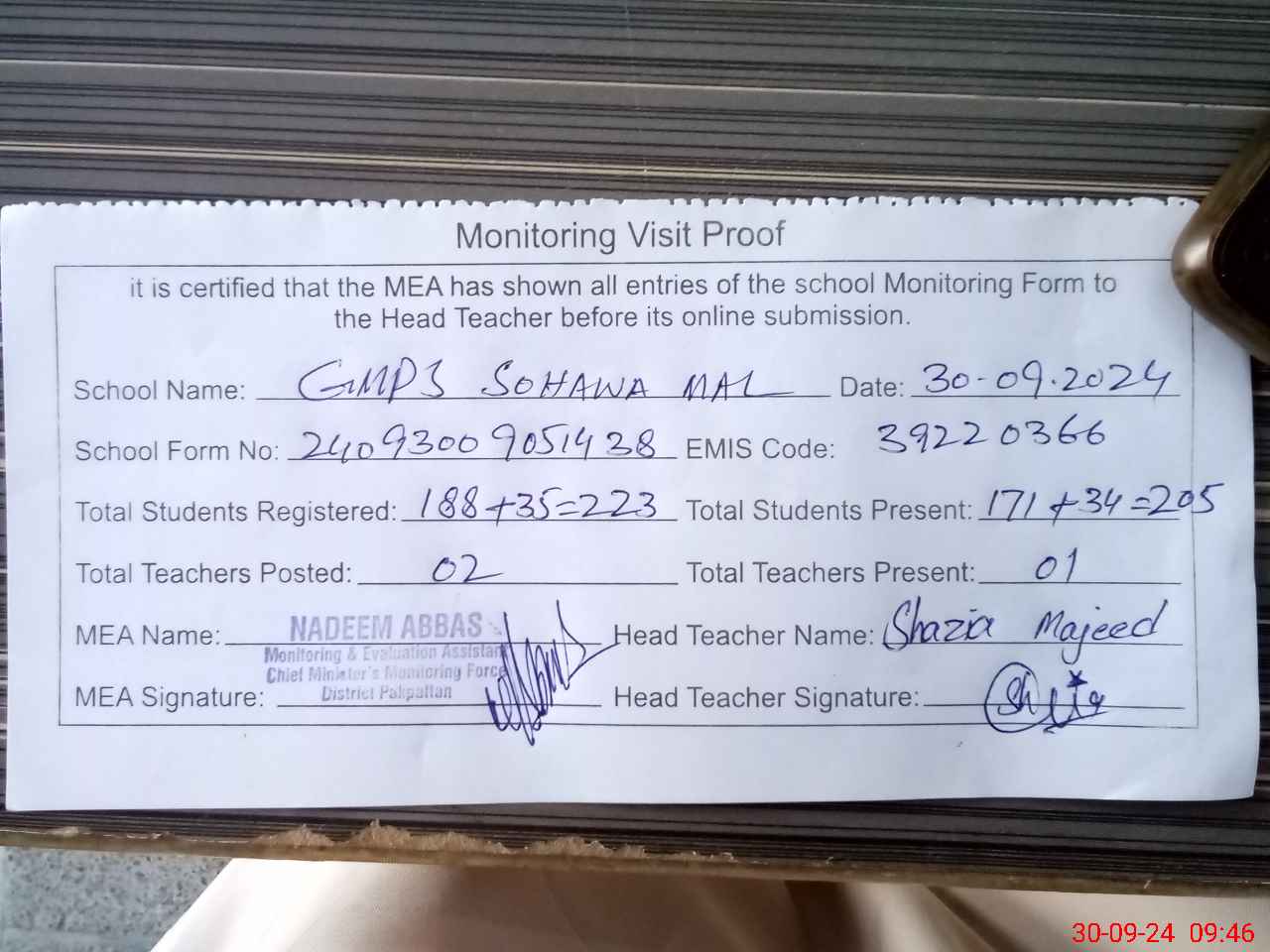 | EMIS Code: 39220366 | Name of School: GMPS SOHAWA MAL | |||