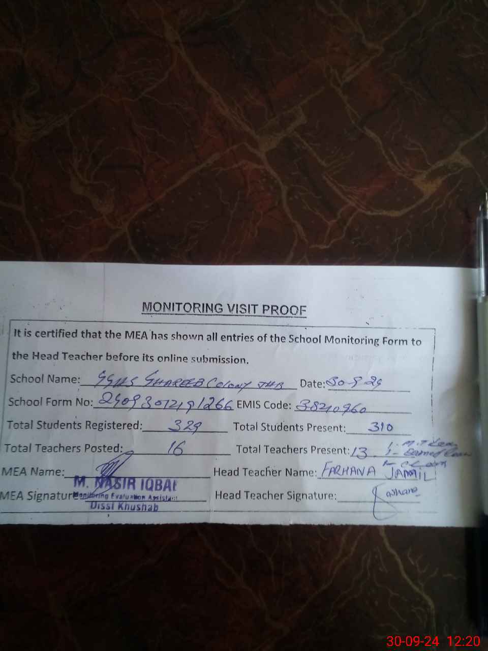 | Attendance Register | Head Teacher | MEA with School | Visit Proof |
