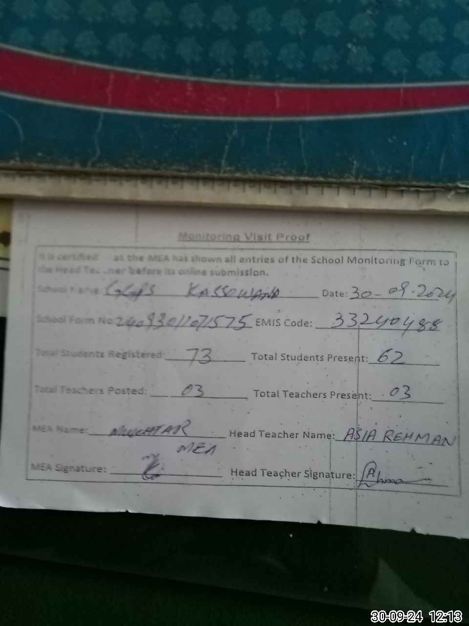 | Name: AS**** RE**** Designation: (School Headmaster's/Headmistress's) SST Phone/Cell Number: 03**** |