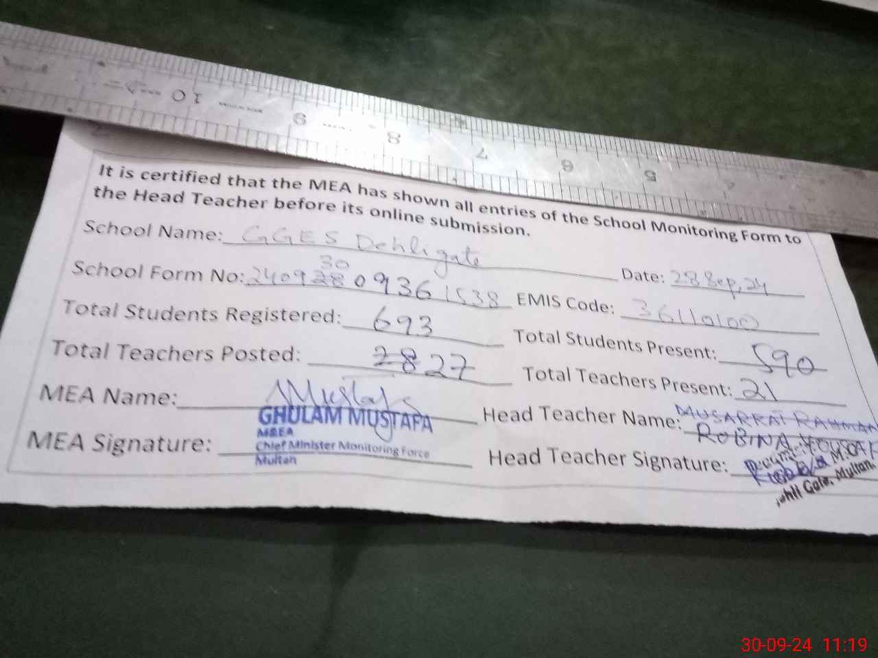 | Monitoring Date: 30-09-2024 | Start Time: 30-09-2024 09:36 AM | End Time: 30-09-2024 11:20 AM | Name of MEA: Gh**** Mu**** | |