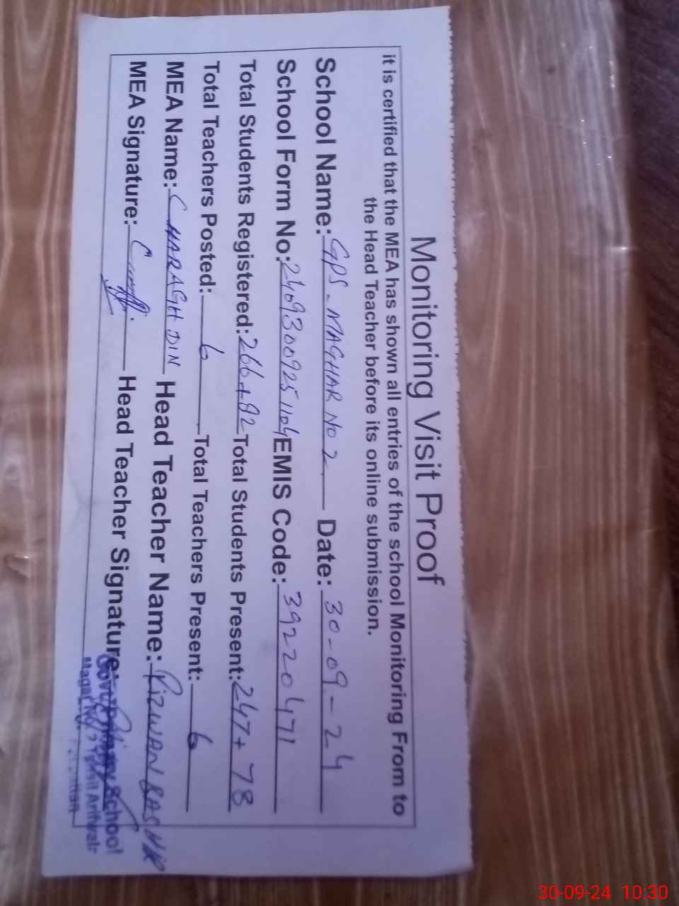 | Attendance Register | Head Teacher | MEA with School | Visit Proof |