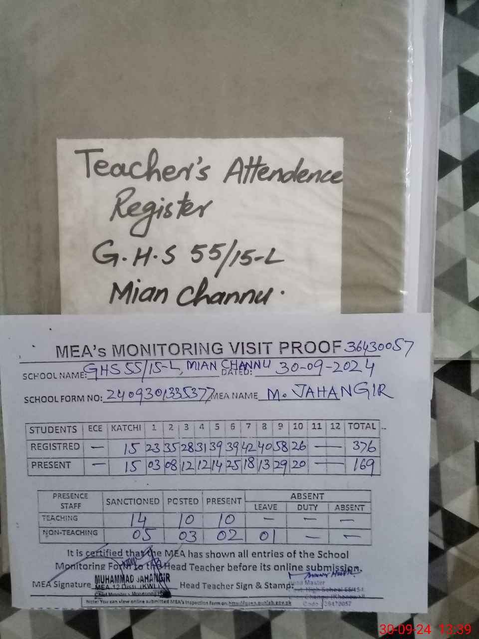 | Attendance Register | Head Teacher | MEA with School | Visit Proof |