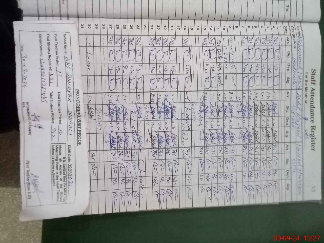 | Attendance Register | Head Teacher | MEA with School | Visit Proof |