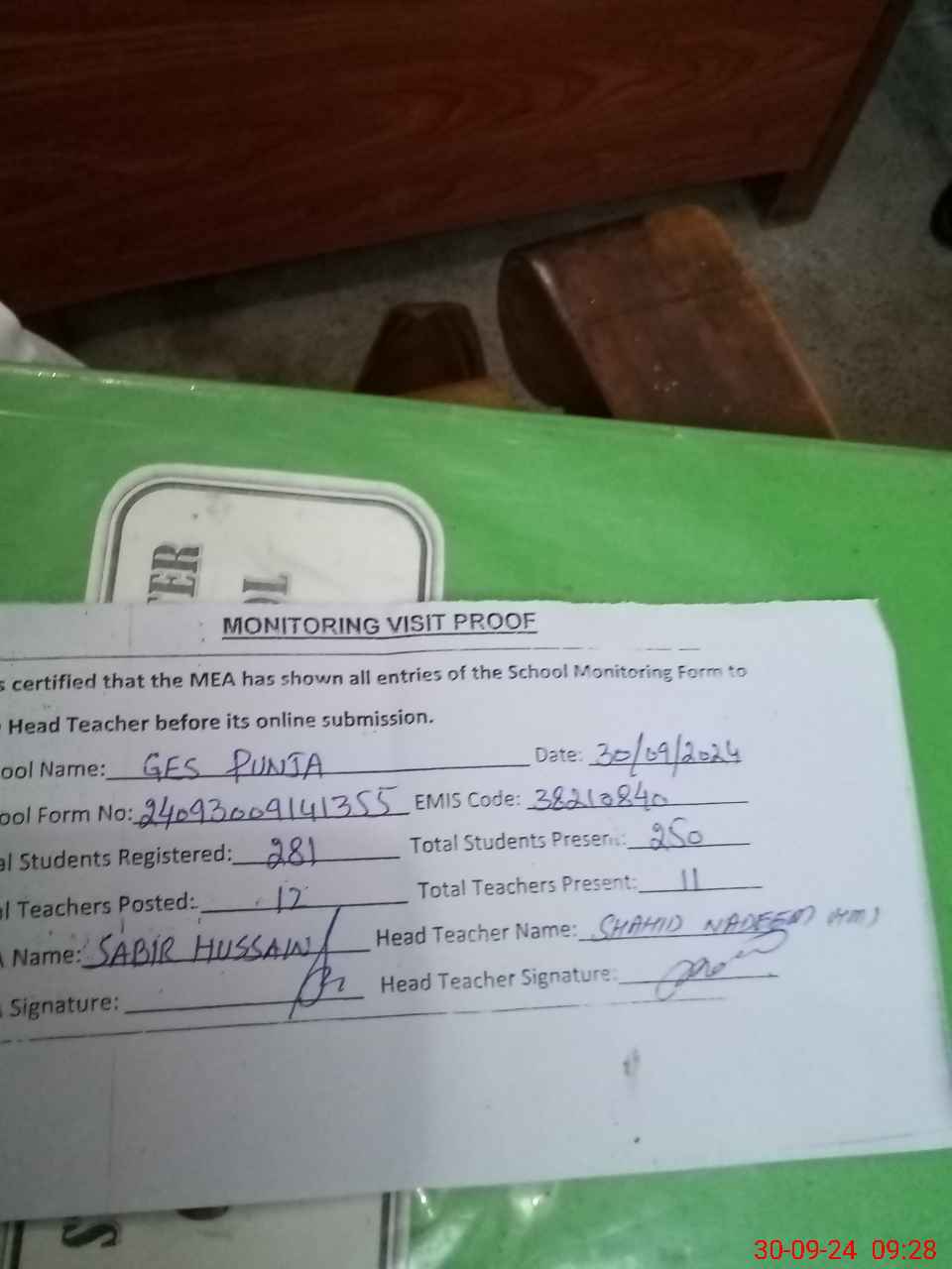 | Attendance Register | Head Teacher | MEA with School | Visit Proof |