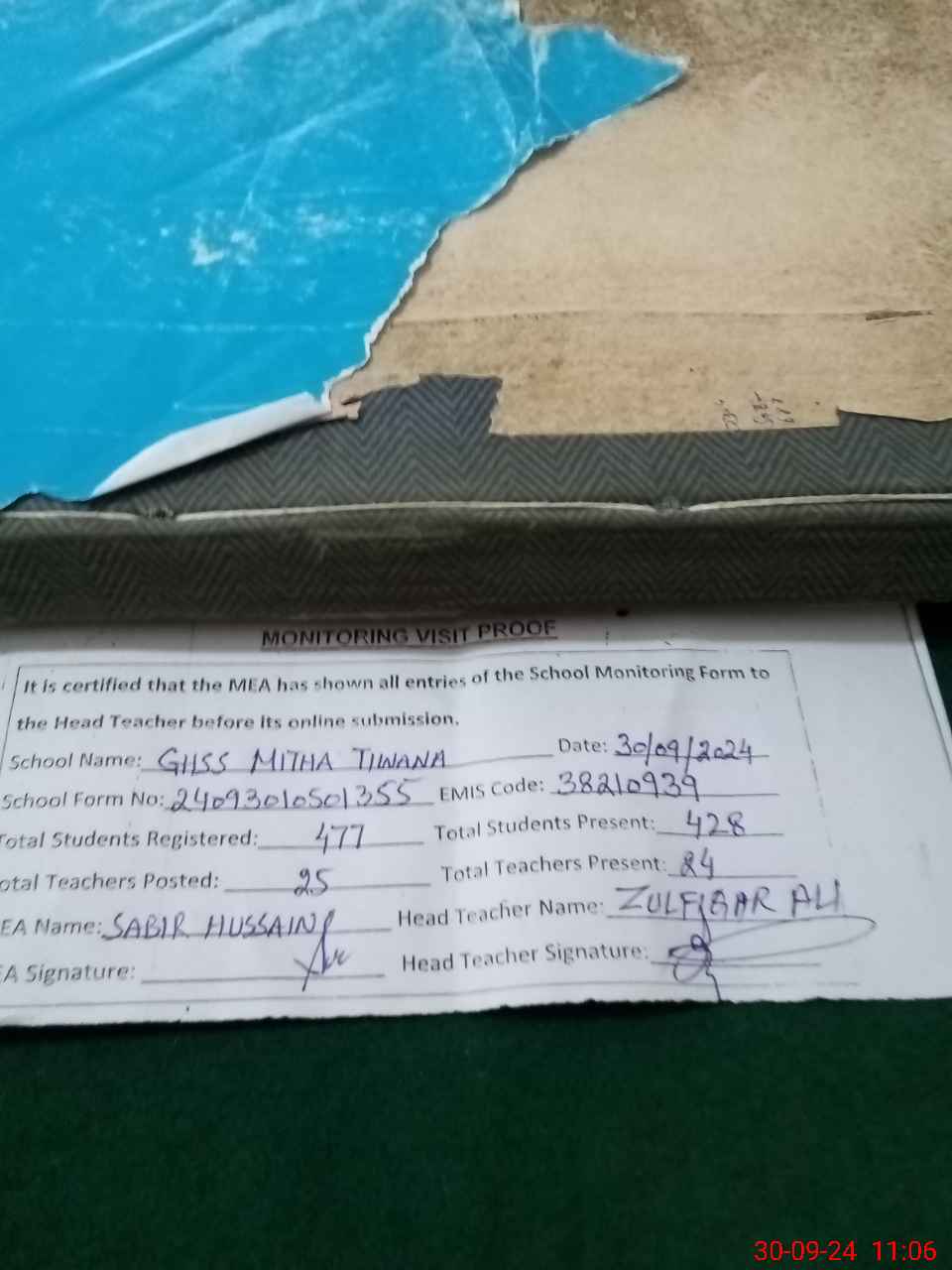 | Certified that this School was Inspected by the Undersigned MEA/DMO Today and the Information Stated Above is as Per Record. | |||||