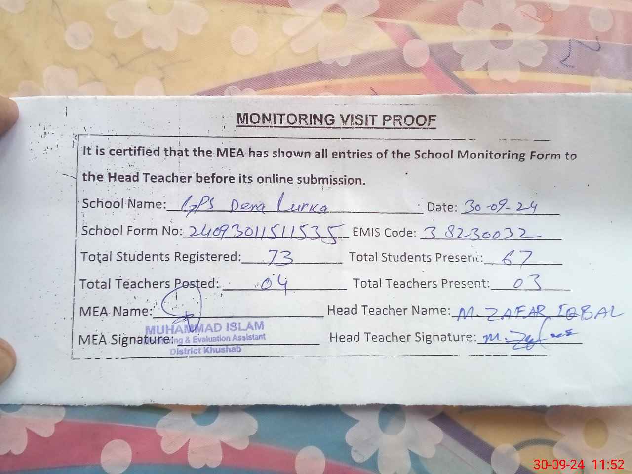 | Attendance Register | Head Teacher | MEA with School | Visit Proof |