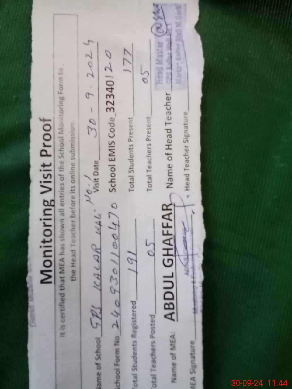 | Attendance Register | Head Teacher | MEA with School | Visit Proof |