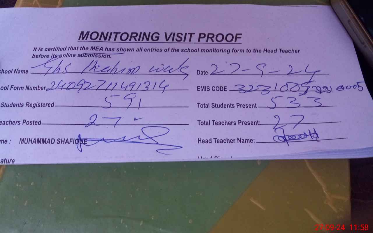 | Attendance Register | Head Teacher | MEA with School | Visit Proof |
