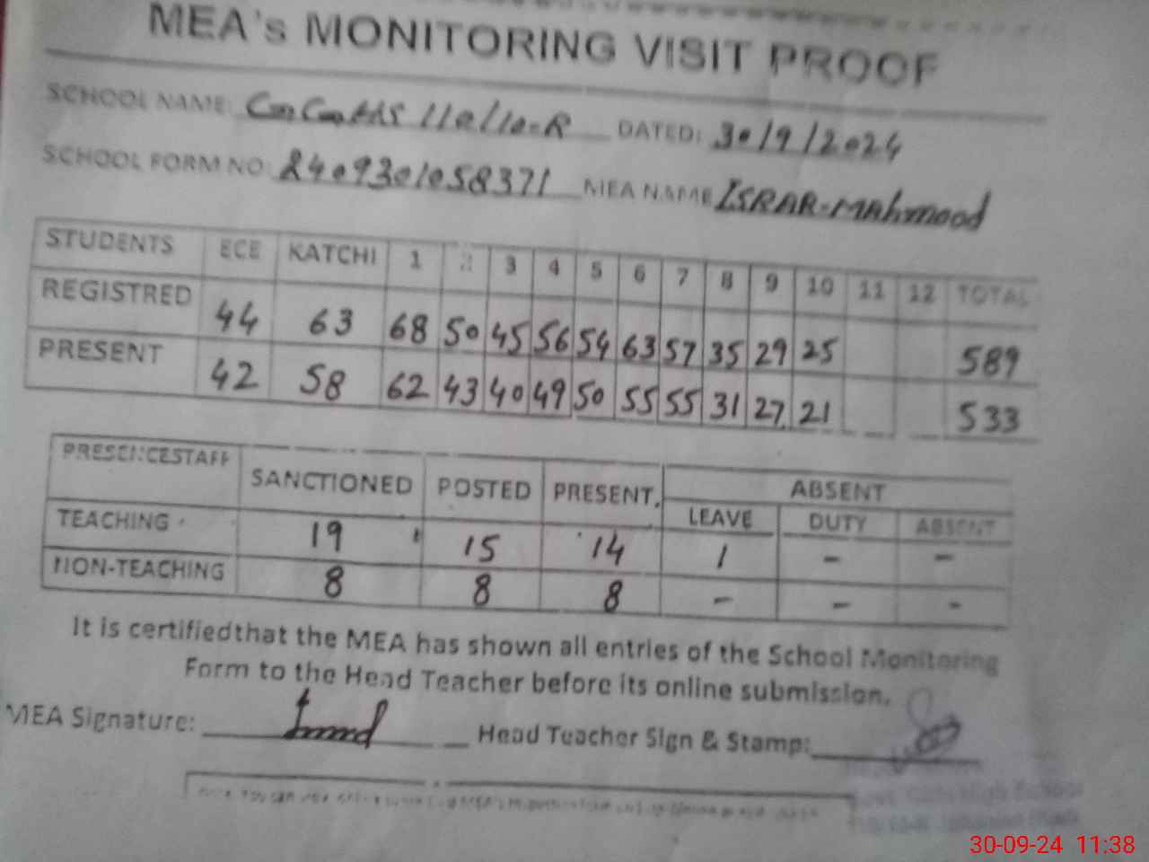 | Attendance Register | Head Teacher | MEA with School | Visit Proof |