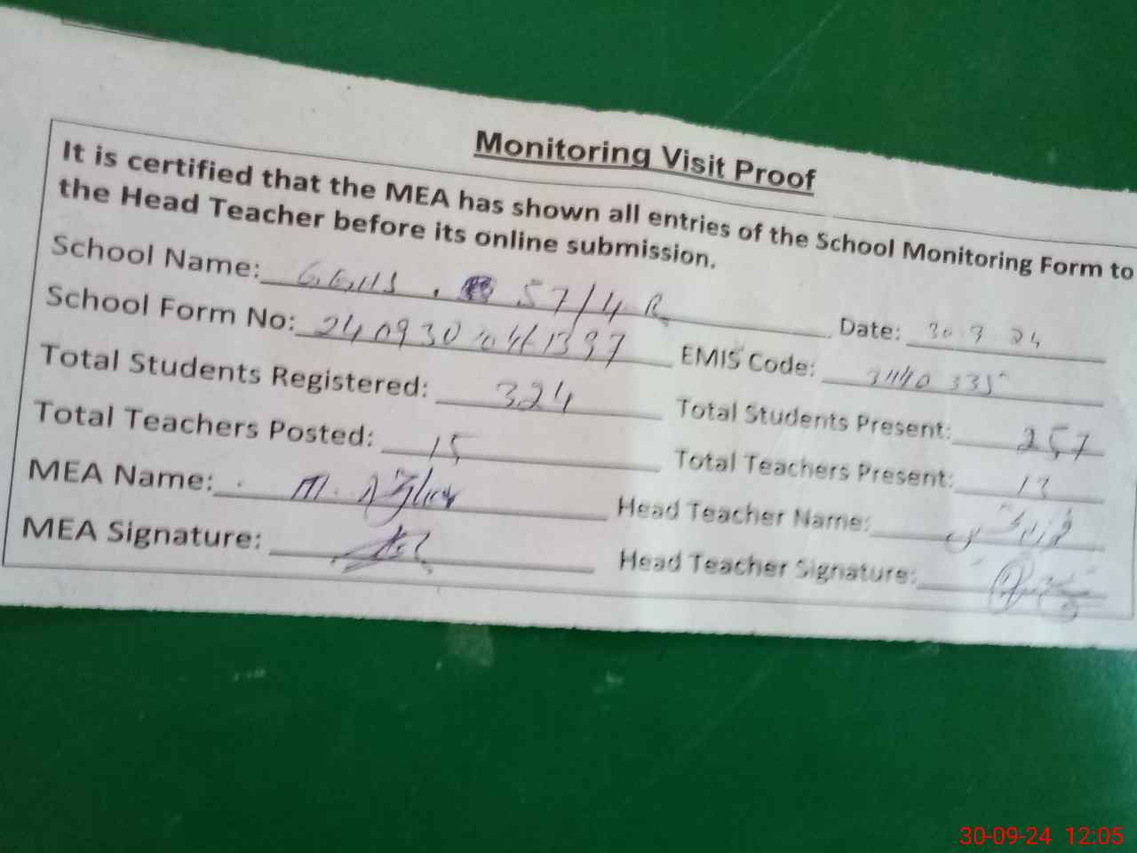 | Attendance Register | Head Teacher | MEA with School | Visit Proof |