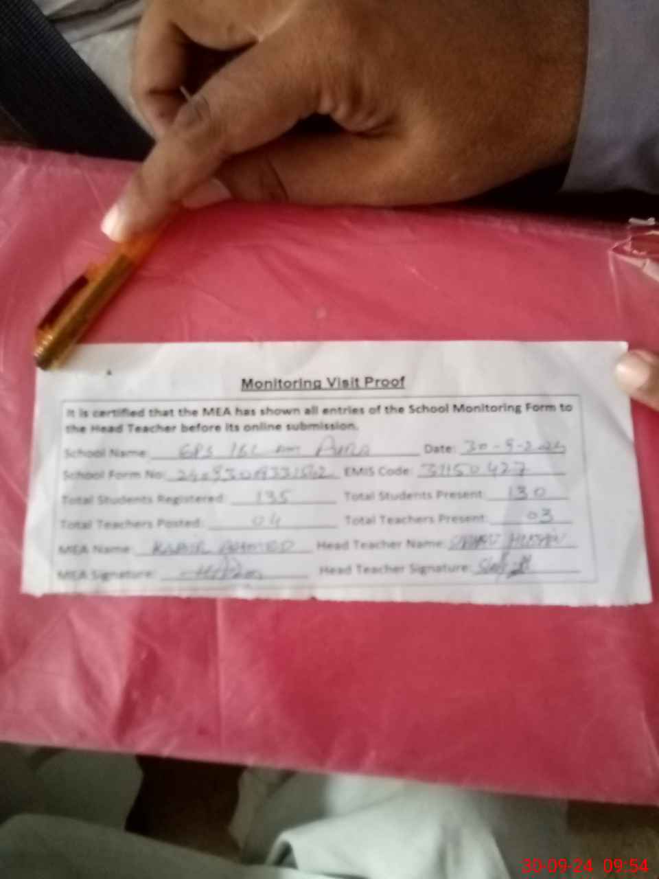 | Attendance Register | Head Teacher | MEA with School | Visit Proof |