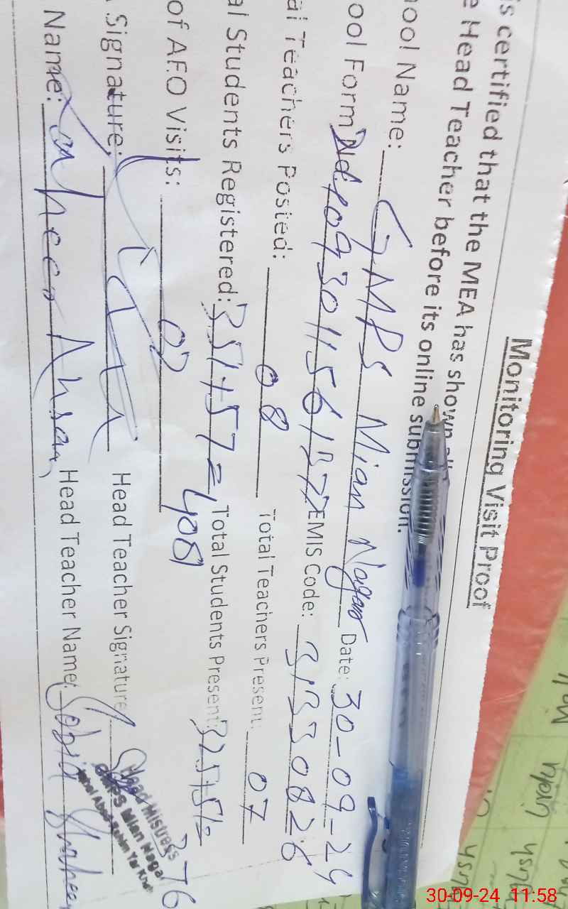 | Attendance Register | Head Teacher | MEA with School | Visit Proof |