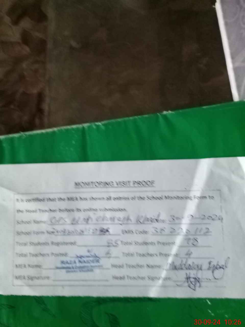 | Attendance Register | Head Teacher | MEA with School | Visit Proof |