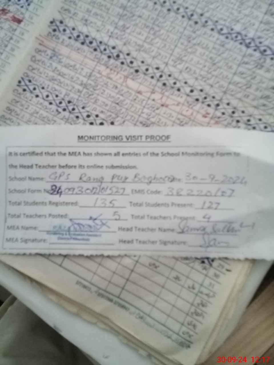 | Attendance Register | Head Teacher | MEA with School | Visit Proof |