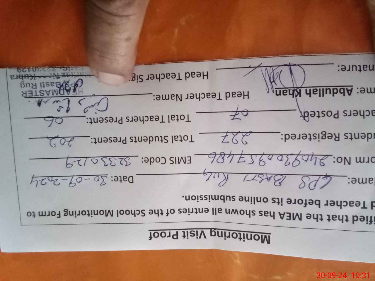| Attendance Register | Head Teacher | MEA with School | Visit Proof |