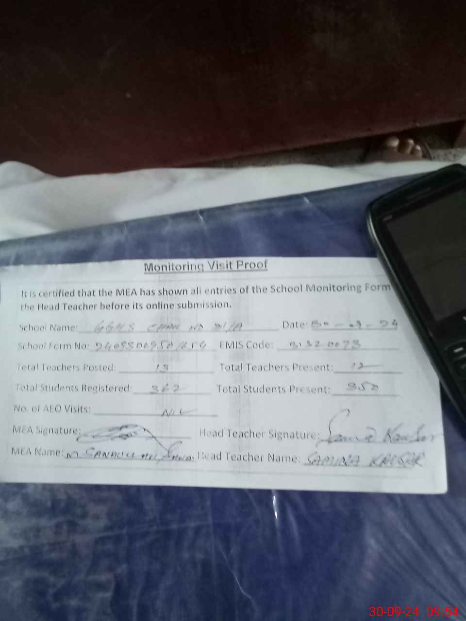 | Attendance Register | Head Teacher | MEA with School | Visit Proof |
