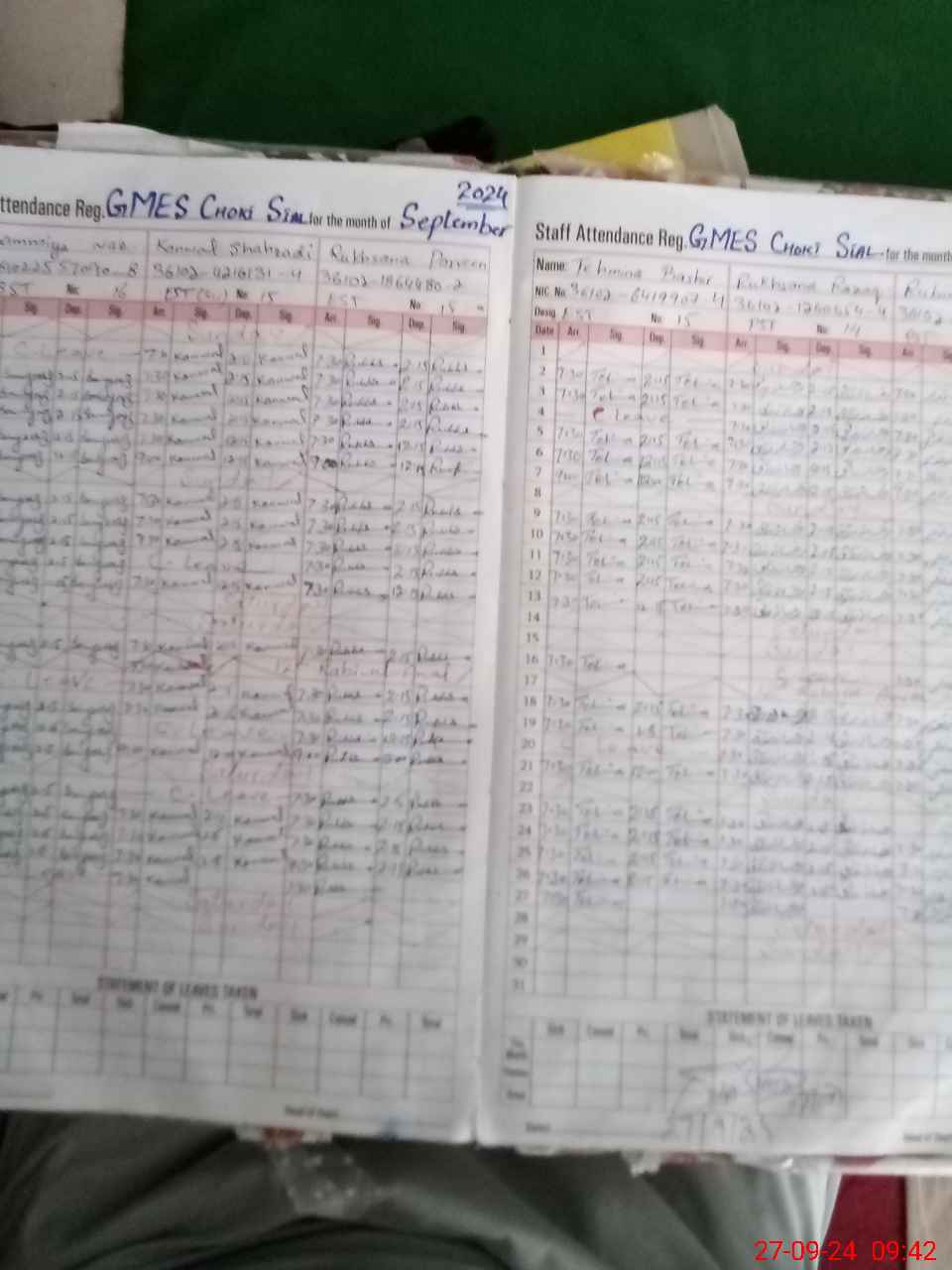 | Remarks (Use Separate Page if Required): The head teacher sumia Naz sst mark leave on attendance register but not approved by dypti deo so she mark as absent | |||||