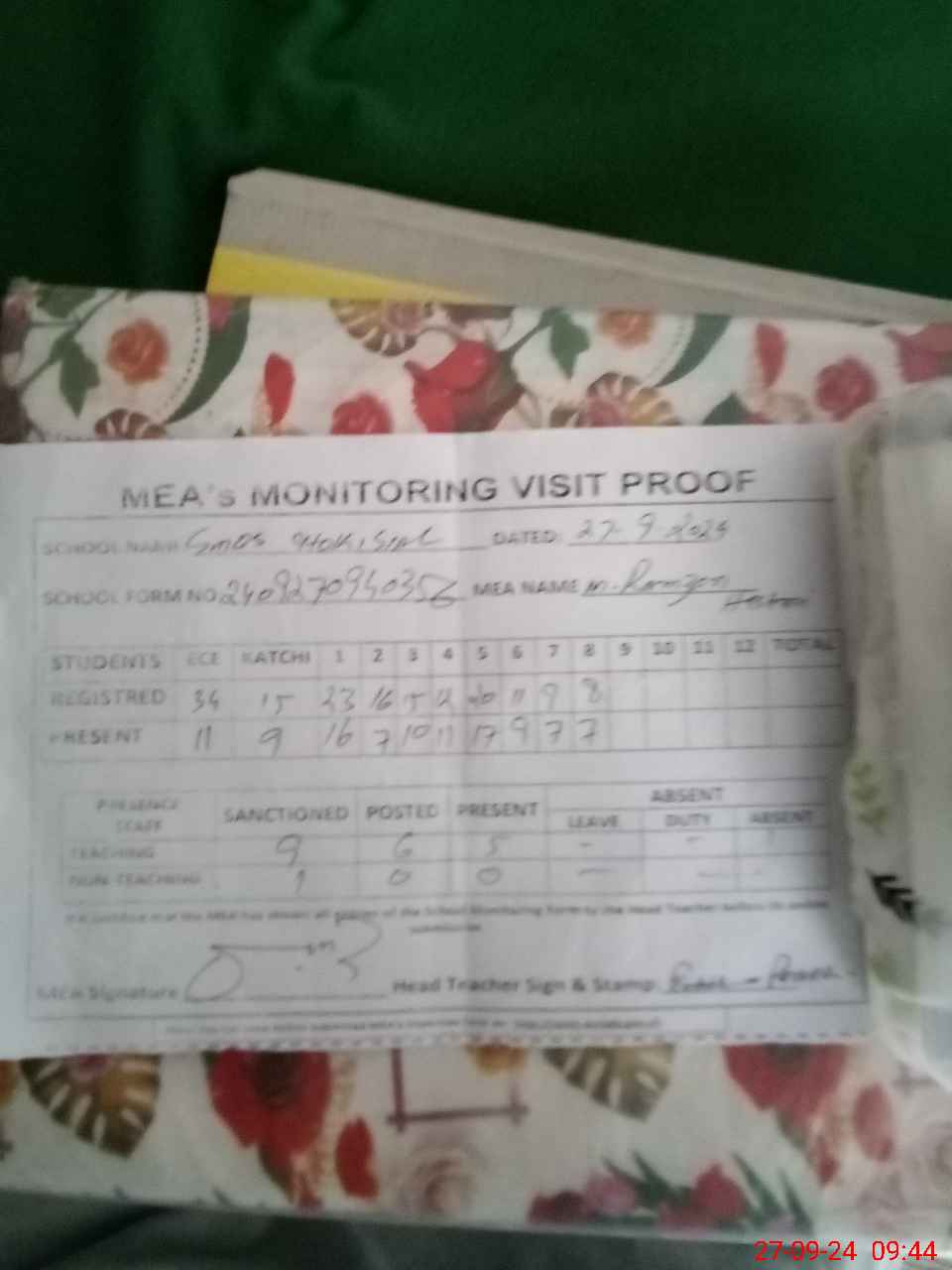 | Attendance Register | Head Teacher | MEA with School | Visit Proof |