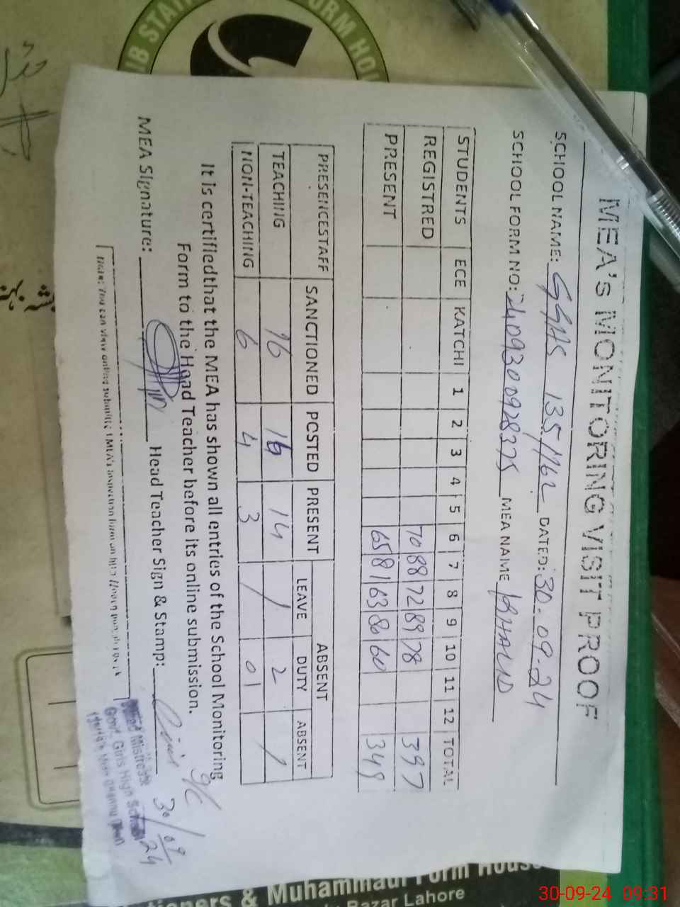 | Attendance Register | Head Teacher | MEA with School | Visit Proof |