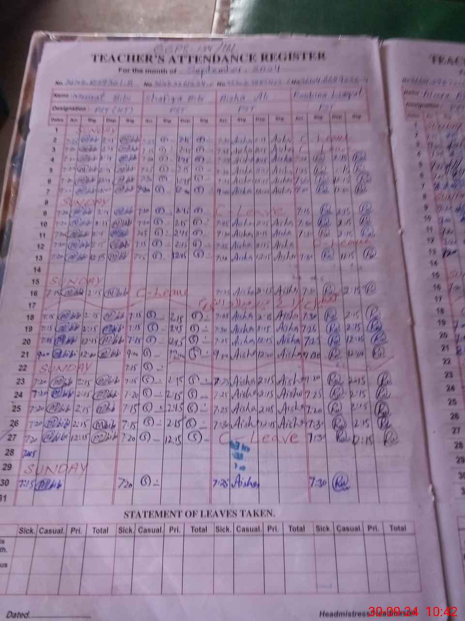 | Leave | Duty | Absent | Maternity | Medical | Ex- Pak |