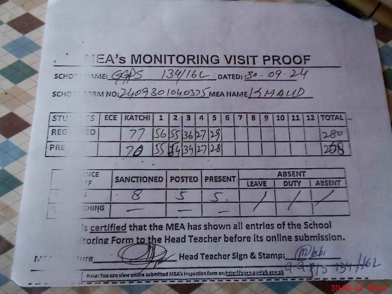 | Attendance Register | Head Teacher | MEA with School | Visit Proof |