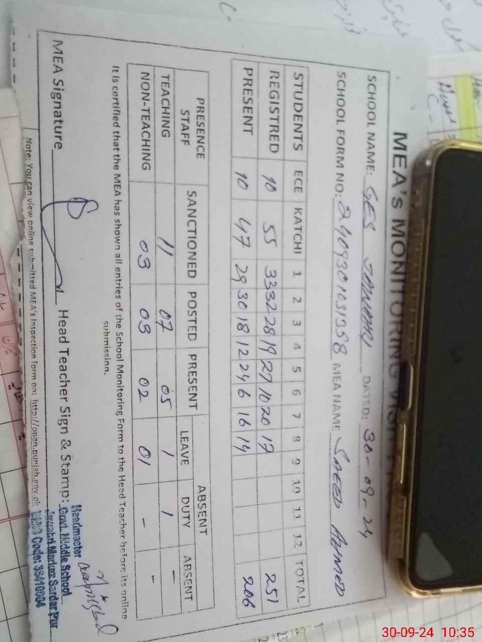 | Monitoring Date: 30-09-2024 | Start Time: 30-09-2024 09:59 AM | End Time: 30-09-2024 10:37 AM | Name of MEA: Sa**** Ah**** | |