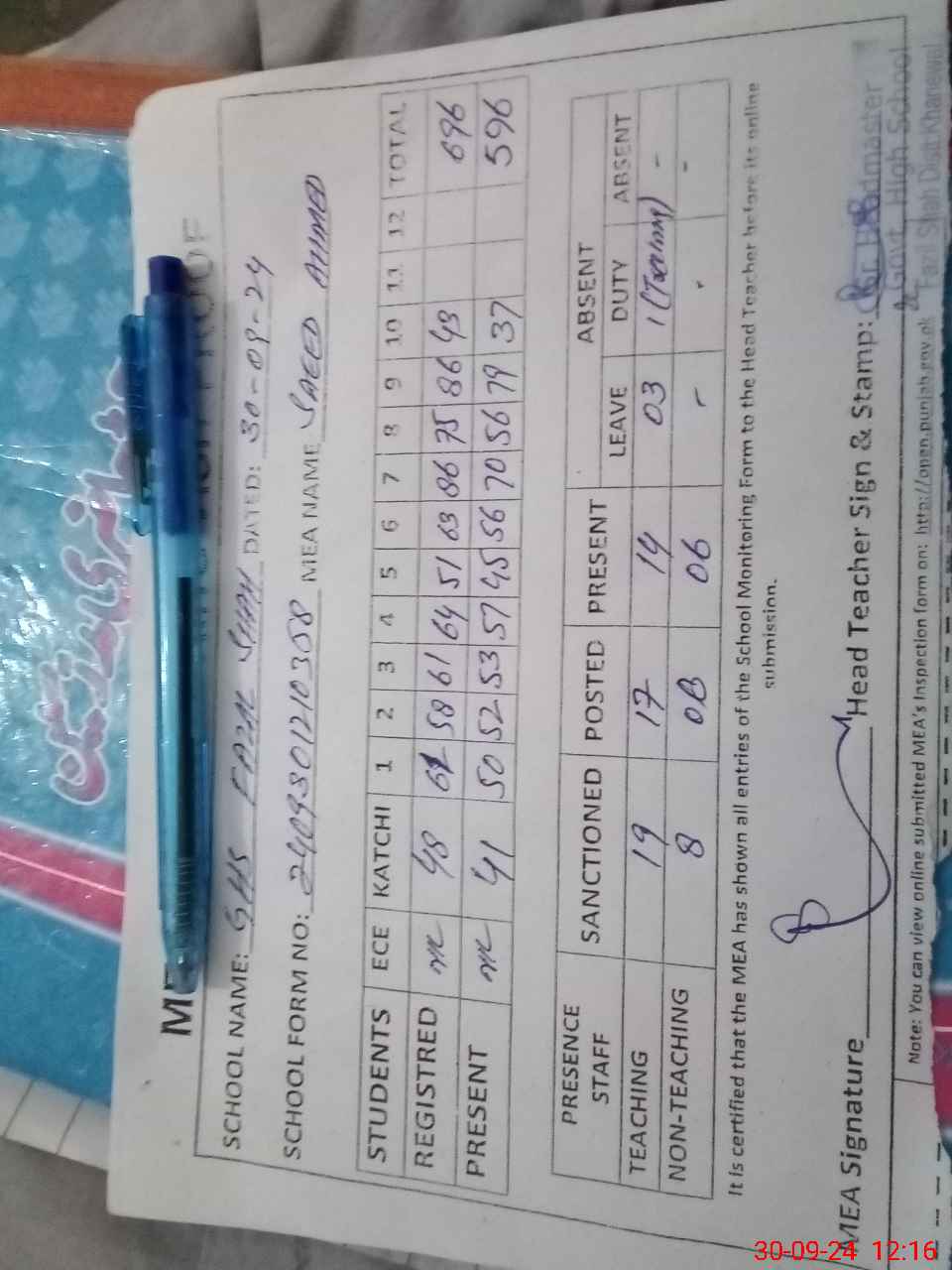 | Remarks (Use Separate Page if Required): SST MUHAMMAD IQBAL SST MUSHTAQ AHMED BOTH TRANSFERED IN THIS SCHOOL BUT NOT IN TEACHER LIST | |||||
