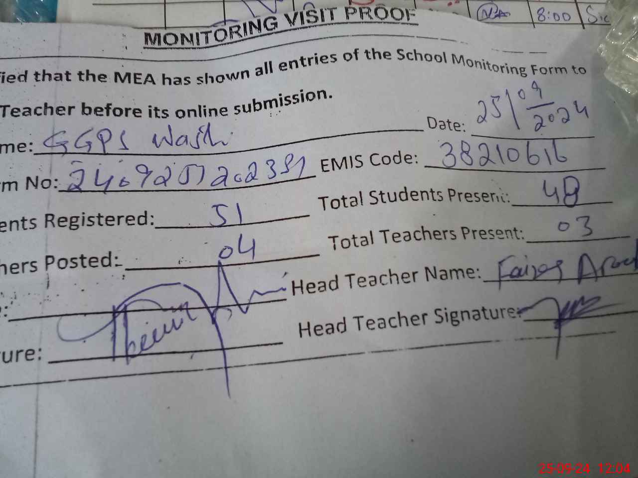 | Attendance Register | Head Teacher | MEA with School | Visit Proof |