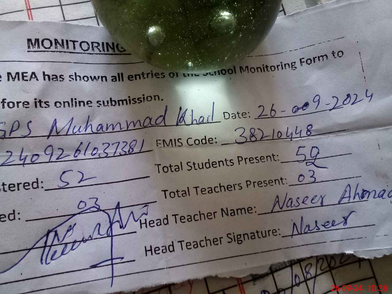 | Monitoring Date: 26-09-2024 | Start Time: 26-09-2024 10:28 AM | End Time: 26-09-2024 10:42 AM | Name of MEA: HA**** GH**** MO**** UDDI**** | |