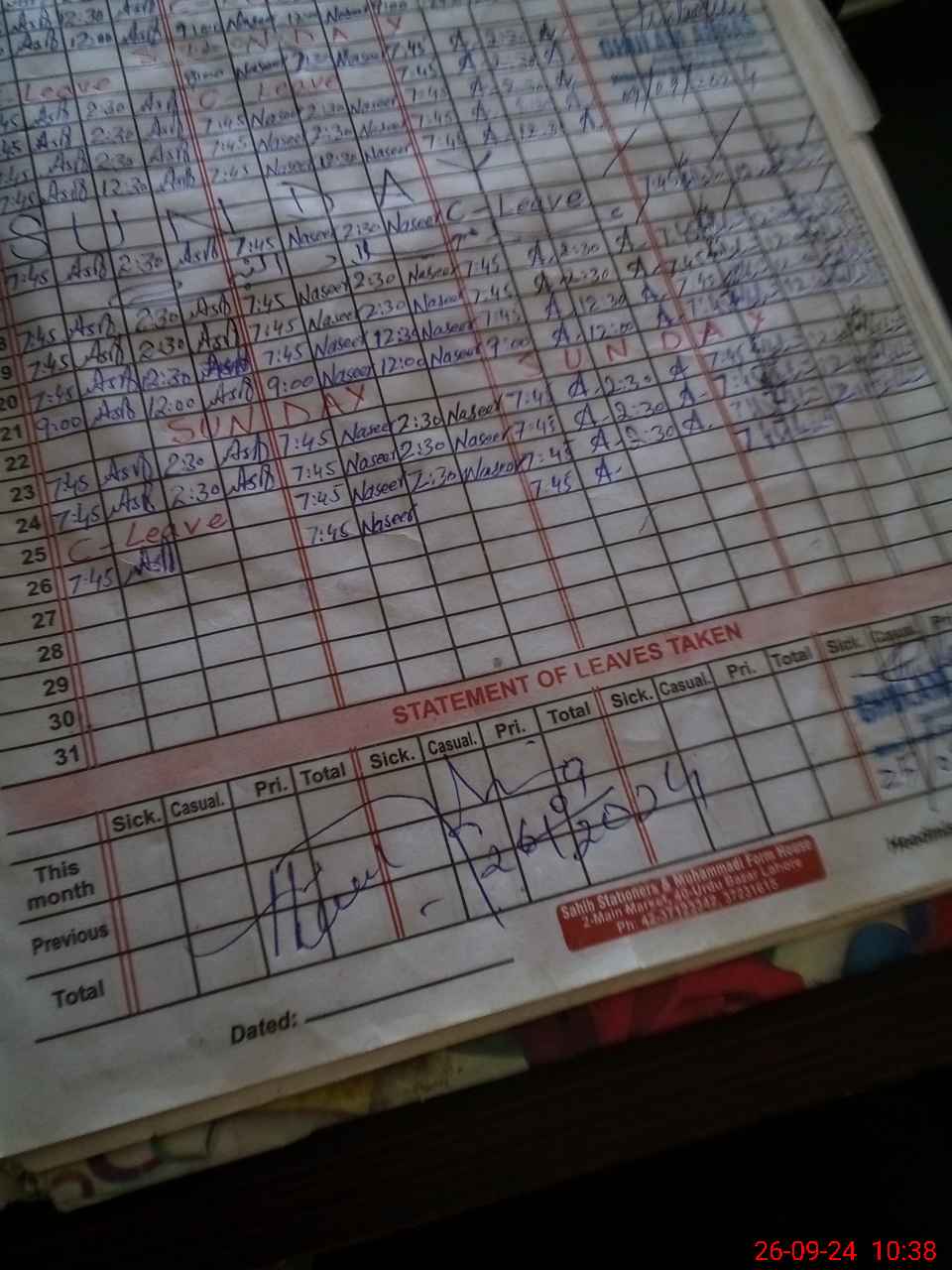 | Leave | Duty | Absent | Maternity | Medical | Ex- Pak |