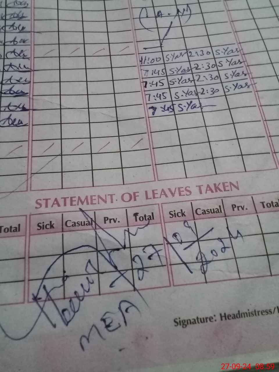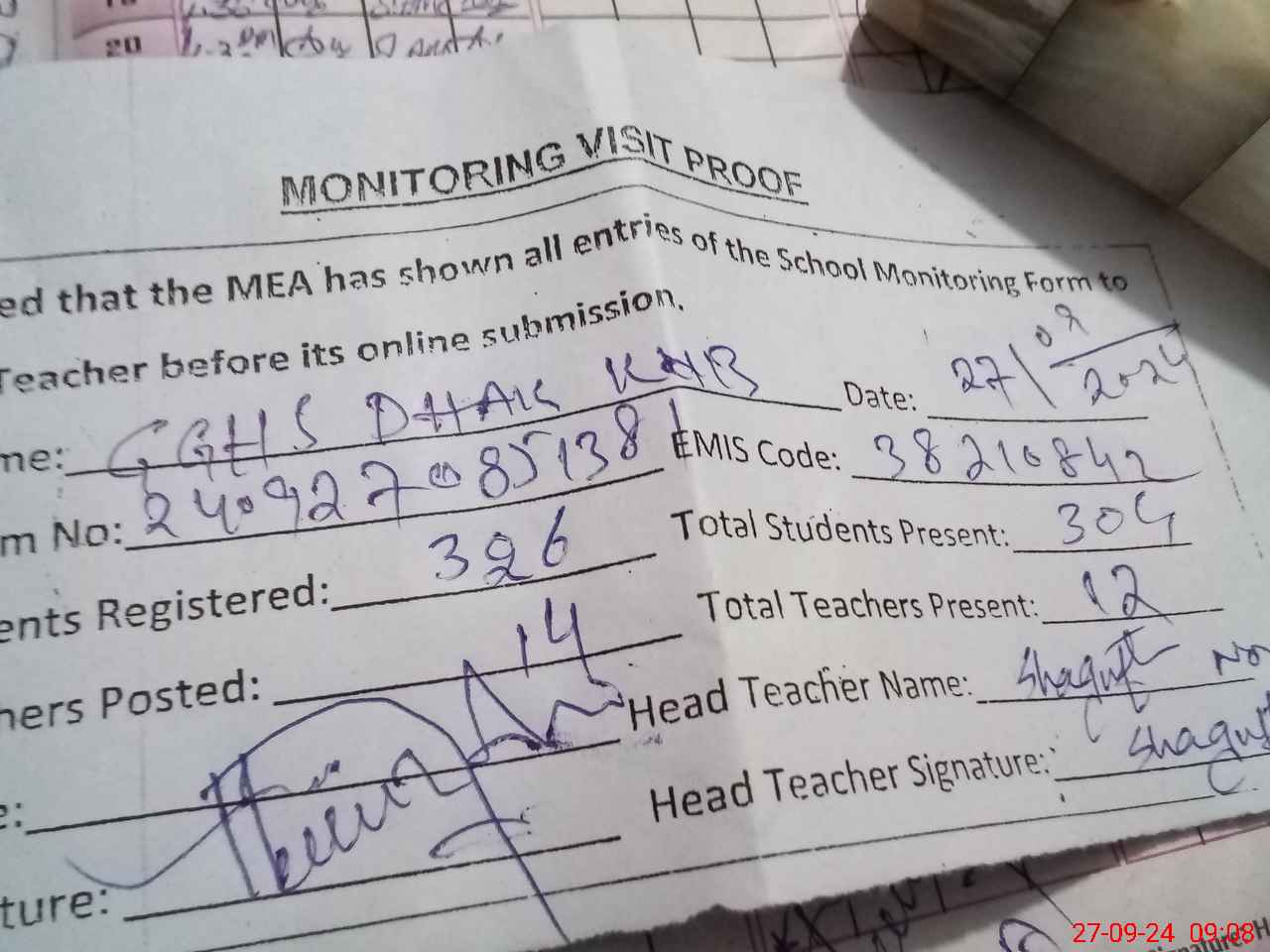 | Attendance Register | Head Teacher | MEA with School | Visit Proof |