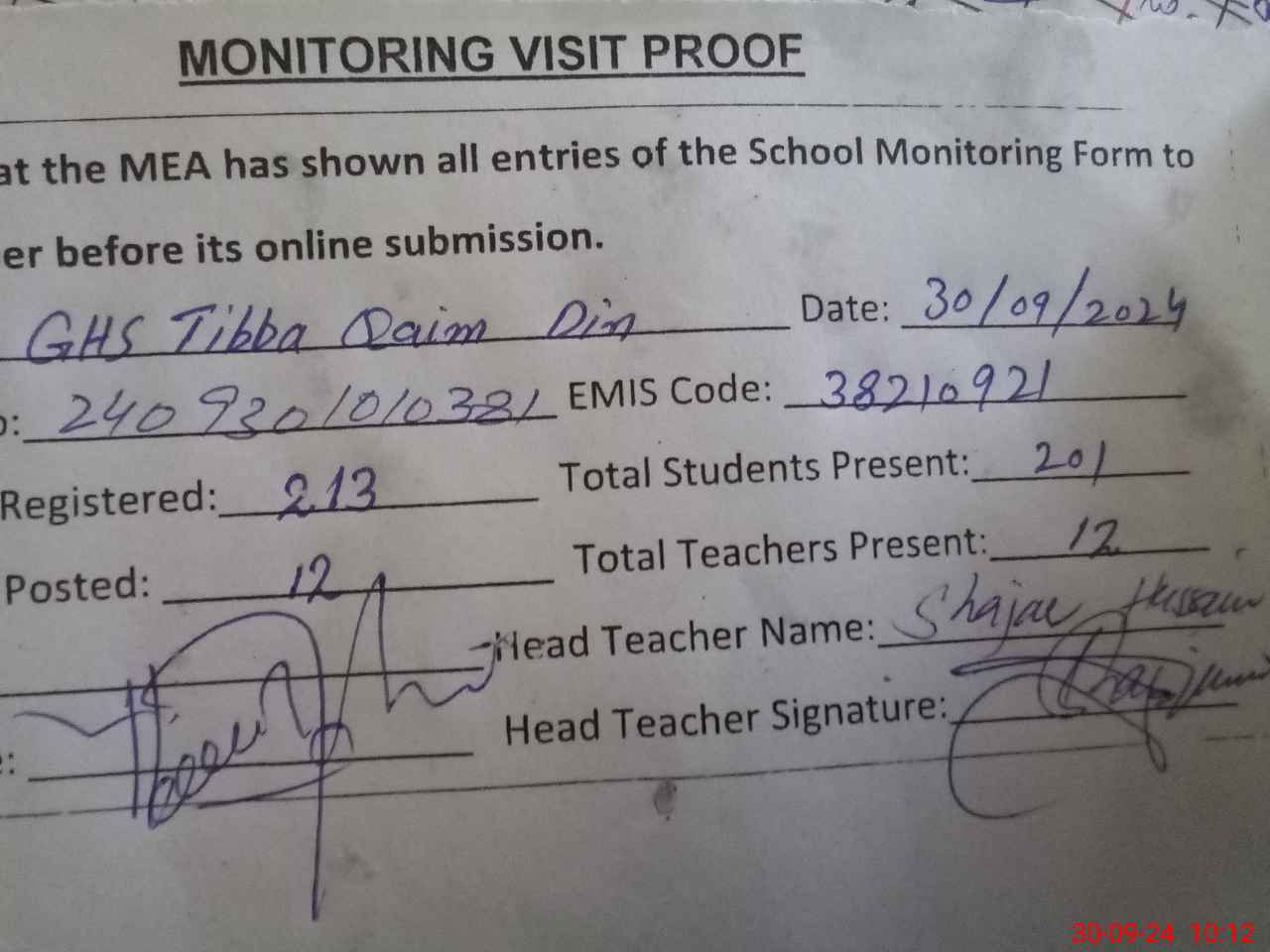 | EMIS Code: 38210921 | Name of School: GHS TIBBA QAIM DIN | |||