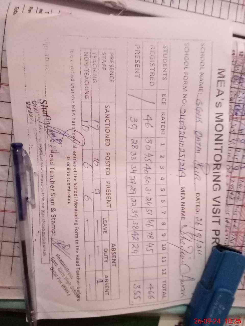 | Attendance Register | Head Teacher | MEA with School | Visit Proof |
