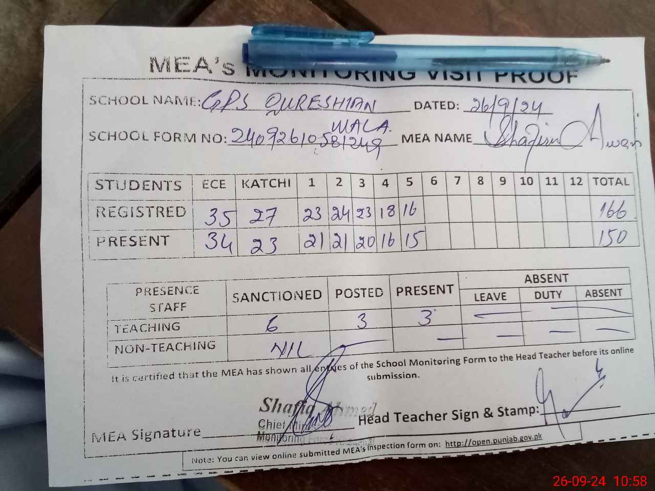 | Attendance Register | Head Teacher | MEA with School | Visit Proof |