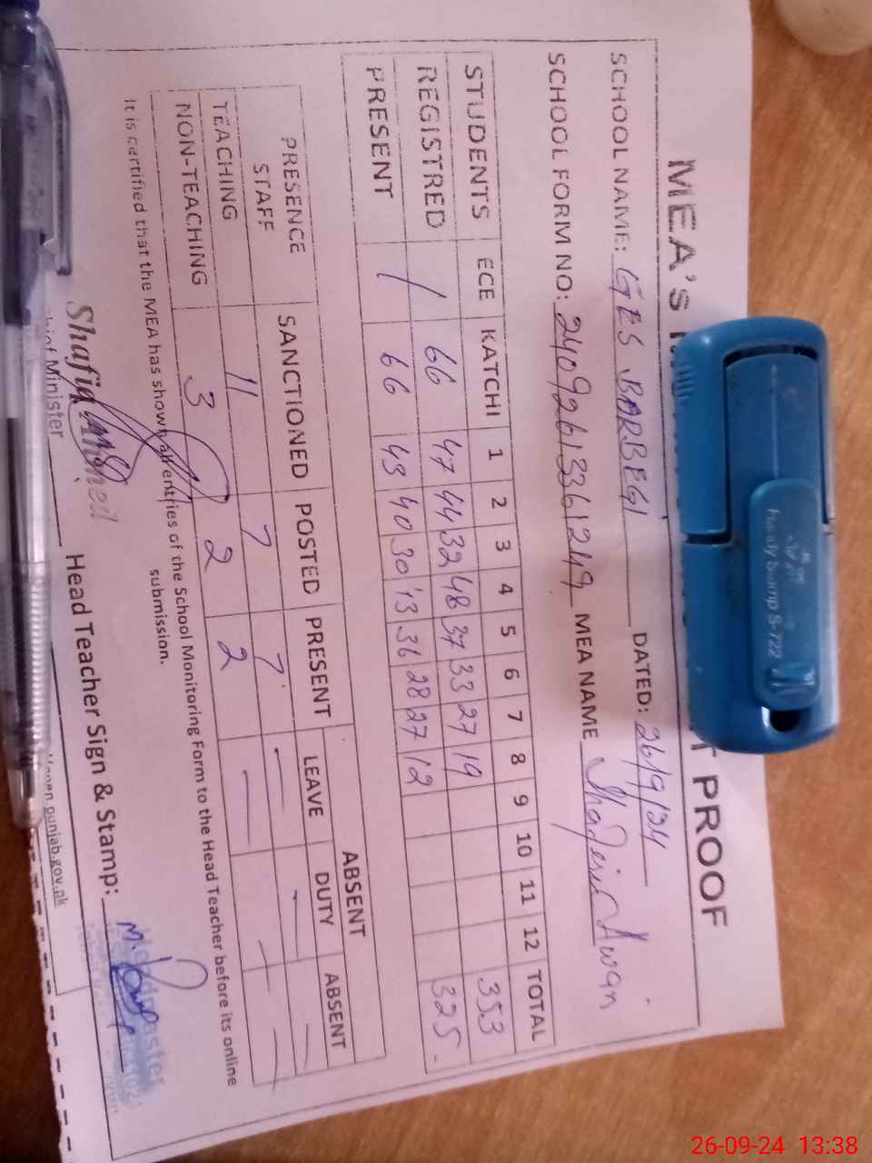 | Attendance Register | Head Teacher | MEA with School | Visit Proof |