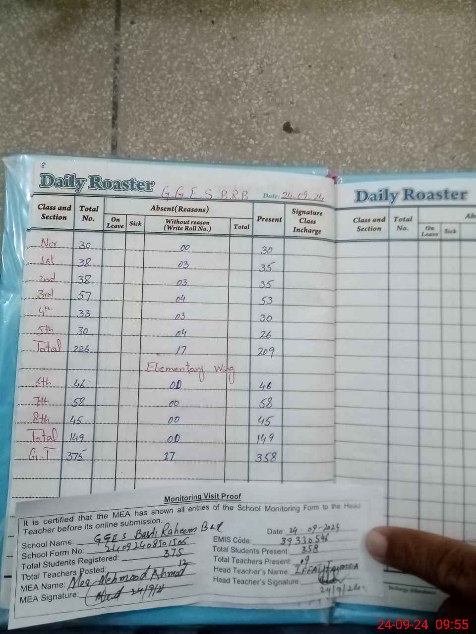 | Attendance Register | Head Teacher | MEA with School | Visit Proof |
