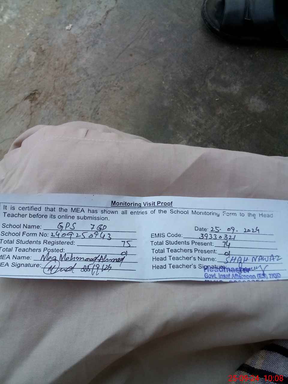| Name: SH**** Designation: (School Headmaster's/Headmistress's) PST Phone/Cell Number: 03**** |