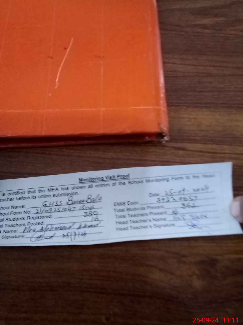| Attendance Register | Head Teacher | MEA with School | Visit Proof |