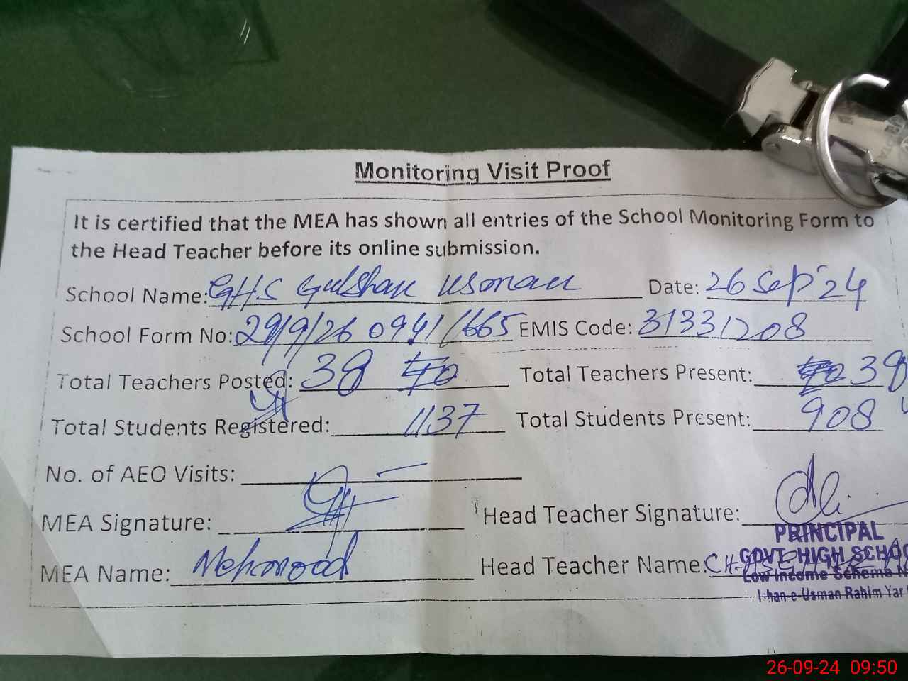 | Attendance Register | Head Teacher | MEA with School | Visit Proof |