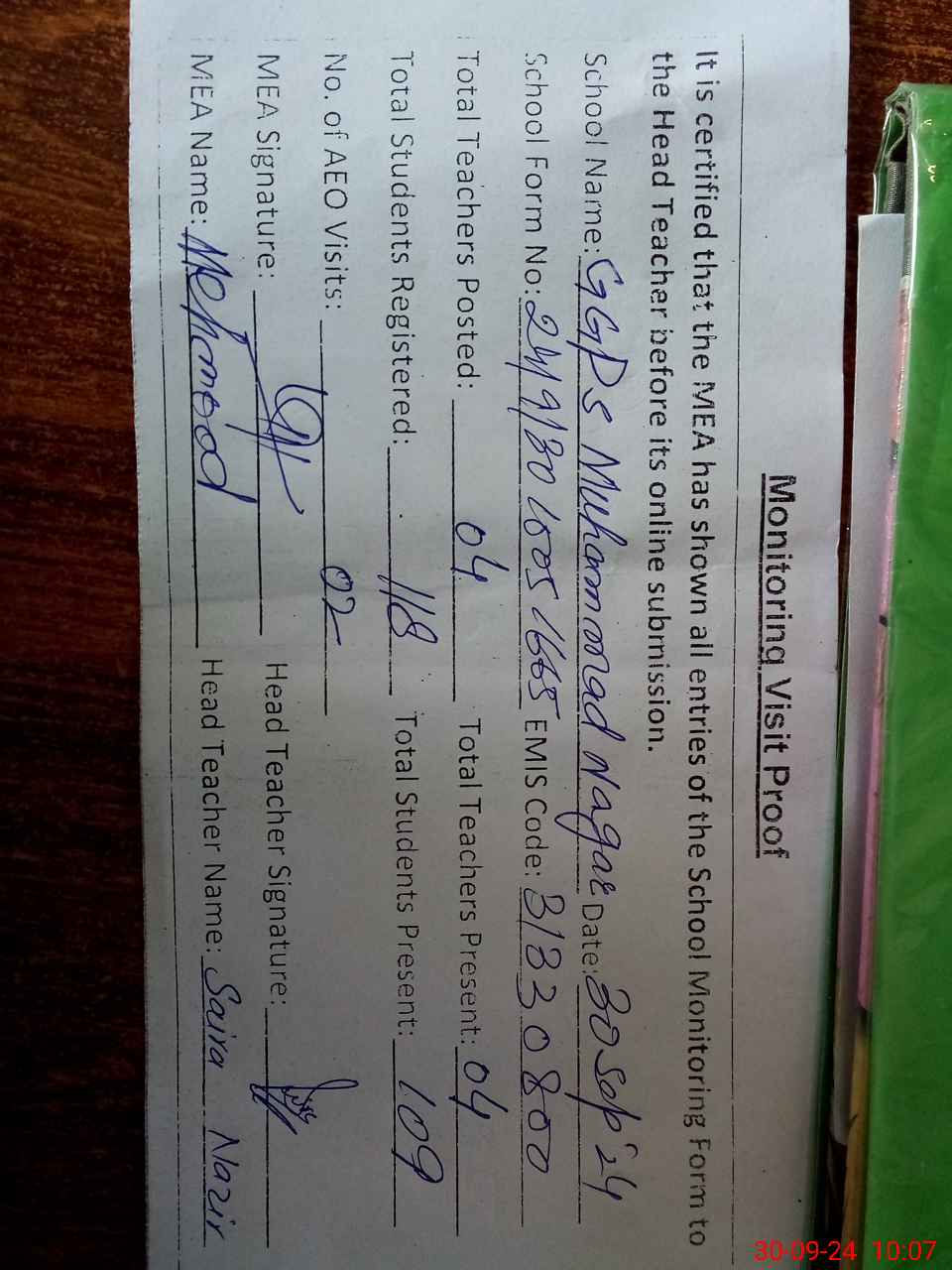 | Attendance Register | Head Teacher | MEA with School | Visit Proof |
