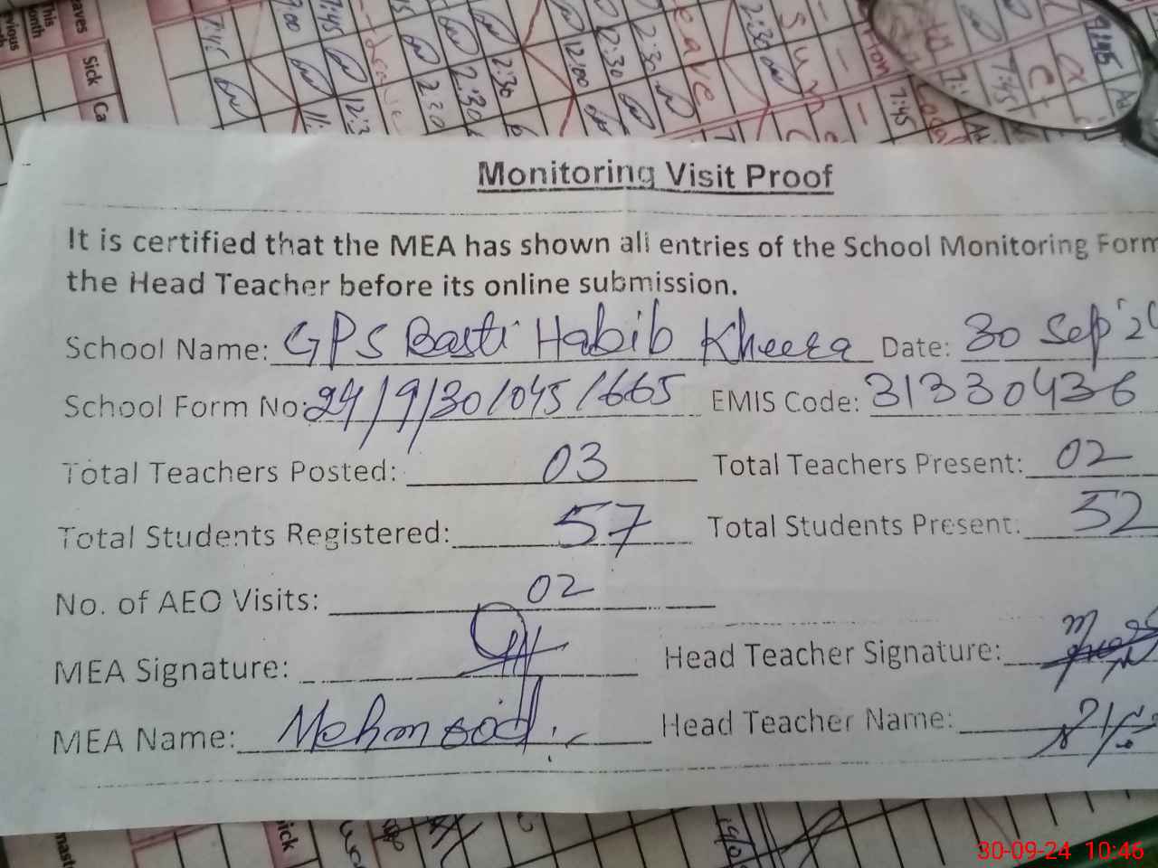 | Attendance Register | Head Teacher | MEA with School | Visit Proof |