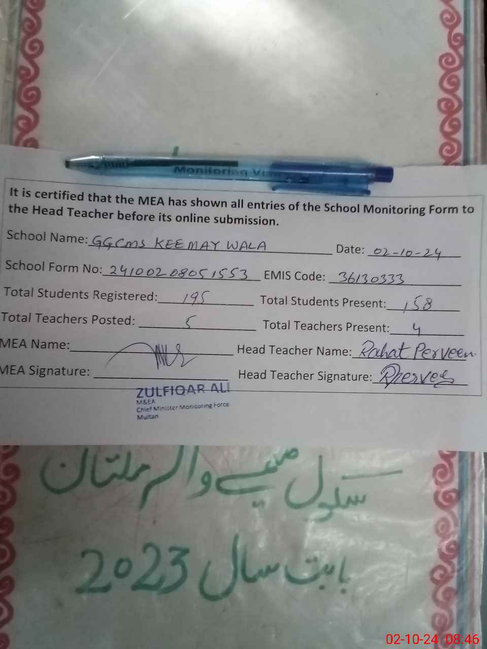 | Monitoring Date: 02-10-2024 | Start Time: 02-10-2024 08:04 AM | End Time: 02-10-2024 08:49 AM | Name of MEA: Zu**** Al**** | |