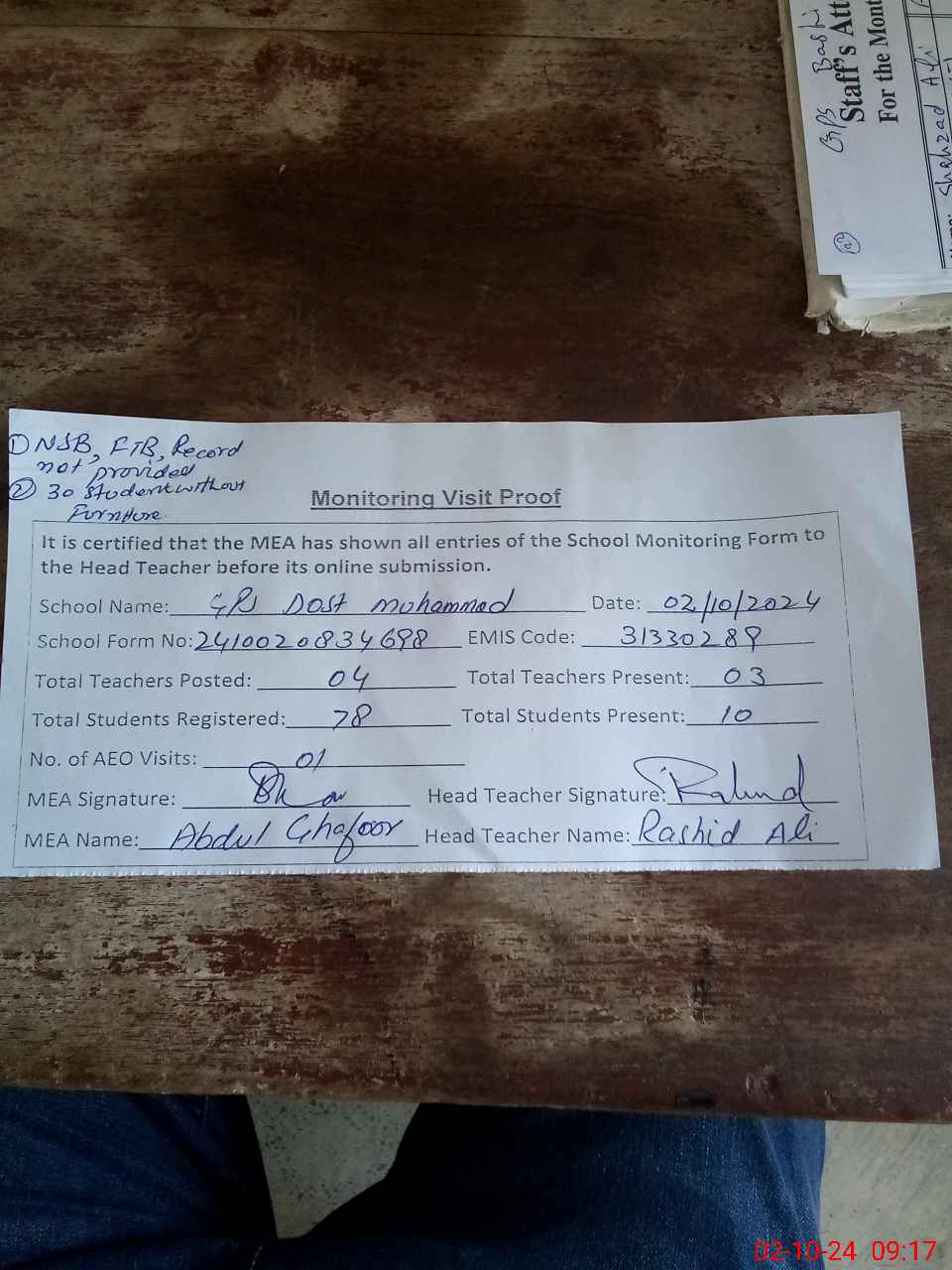 | Attendance Register | Head Teacher | MEA with School | Visit Proof |