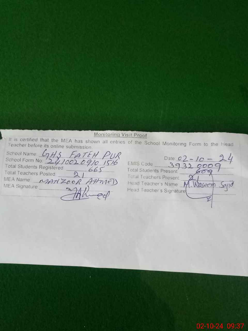 | EMIS Code: 39320009 | Name of School: GHS FATEH PUR | |||