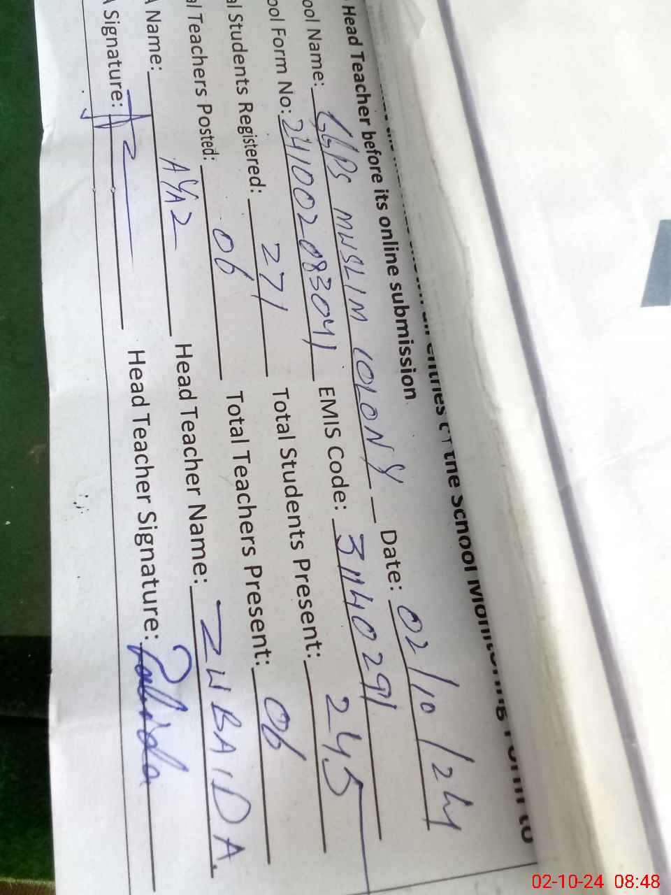 | Name: Zu**** Sh**** Designation: (School Headmaster's/Headmistress's) PST Phone/Cell Number: 03**** |