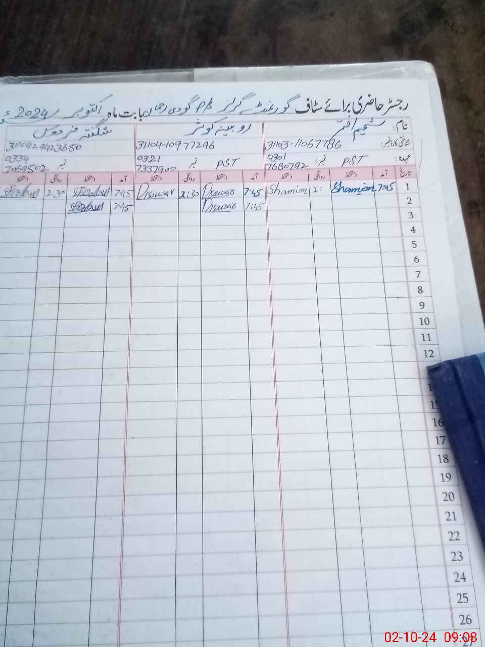 | CNIC | Full Name | Designation | R/C | Absence during last cal. month |