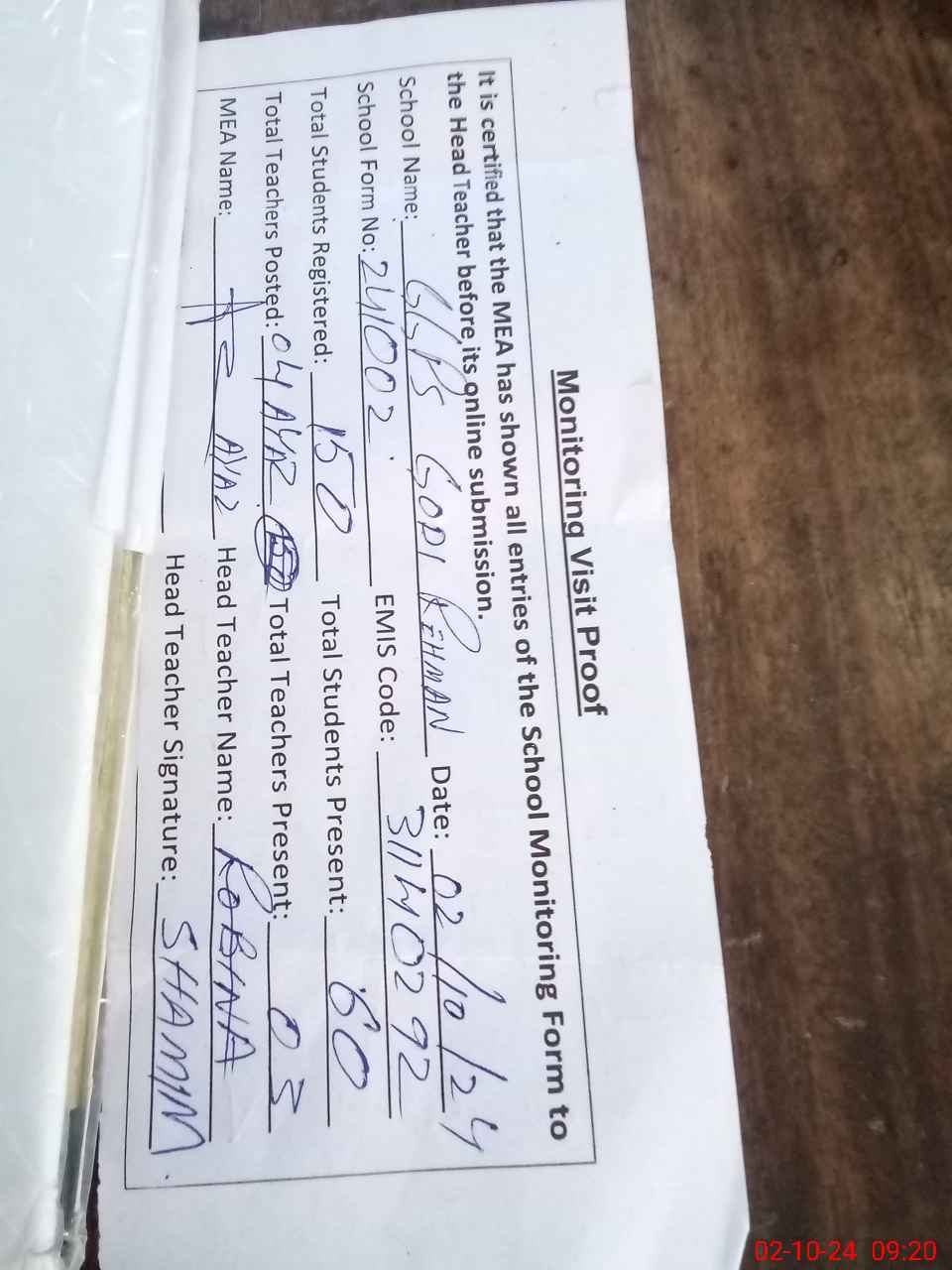 | Remarks (Use Separate Page if Required): Books record nsb and ftf not available as head teacher absent | |||||