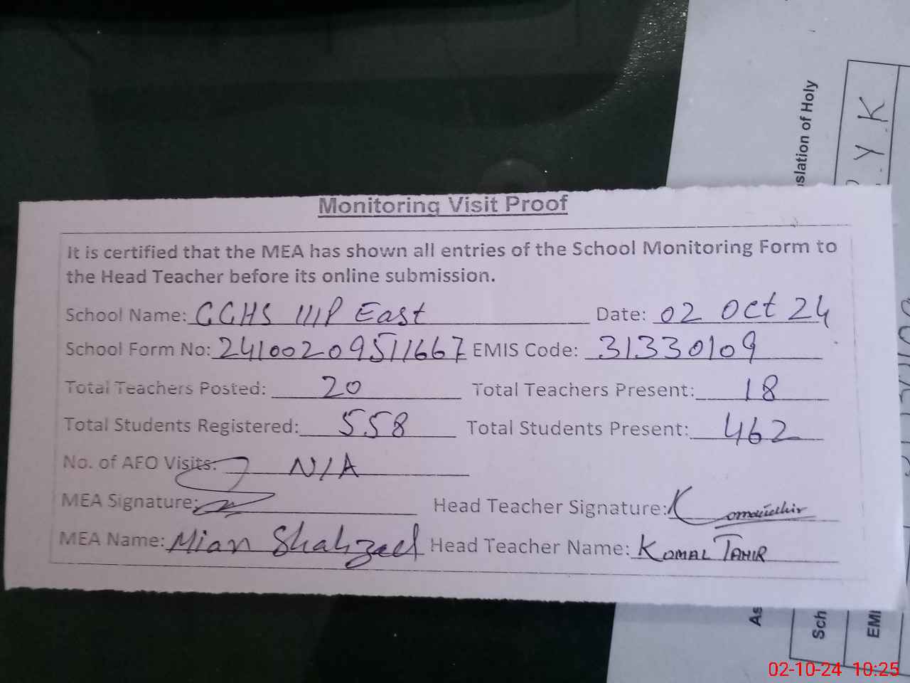 | Monitoring Date: 02-10-2024 | Start Time: 02-10-2024 09:37 AM | End Time: 02-10-2024 10:26 AM | Name of MEA: Sh**** Ah**** | |